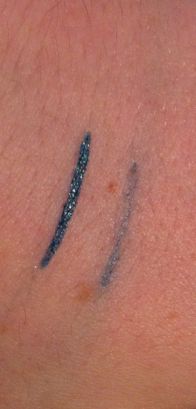 Here it is swatched on my super duper pale cool-toned skin. One swatch is just drawn on, and the other is smudged w/ the smudgey nubbin. The color is beautiful. It’s a peacock blue with just enough green to be teal (ever so slightly greener than in the photo, but my skin is pink so I’m not gonna fight it…). There’s shimmer but no glitter. The texture is dreamily creamy, and extremely pigmented. I barely had to touch the pencil tip to my hand to swatch it.